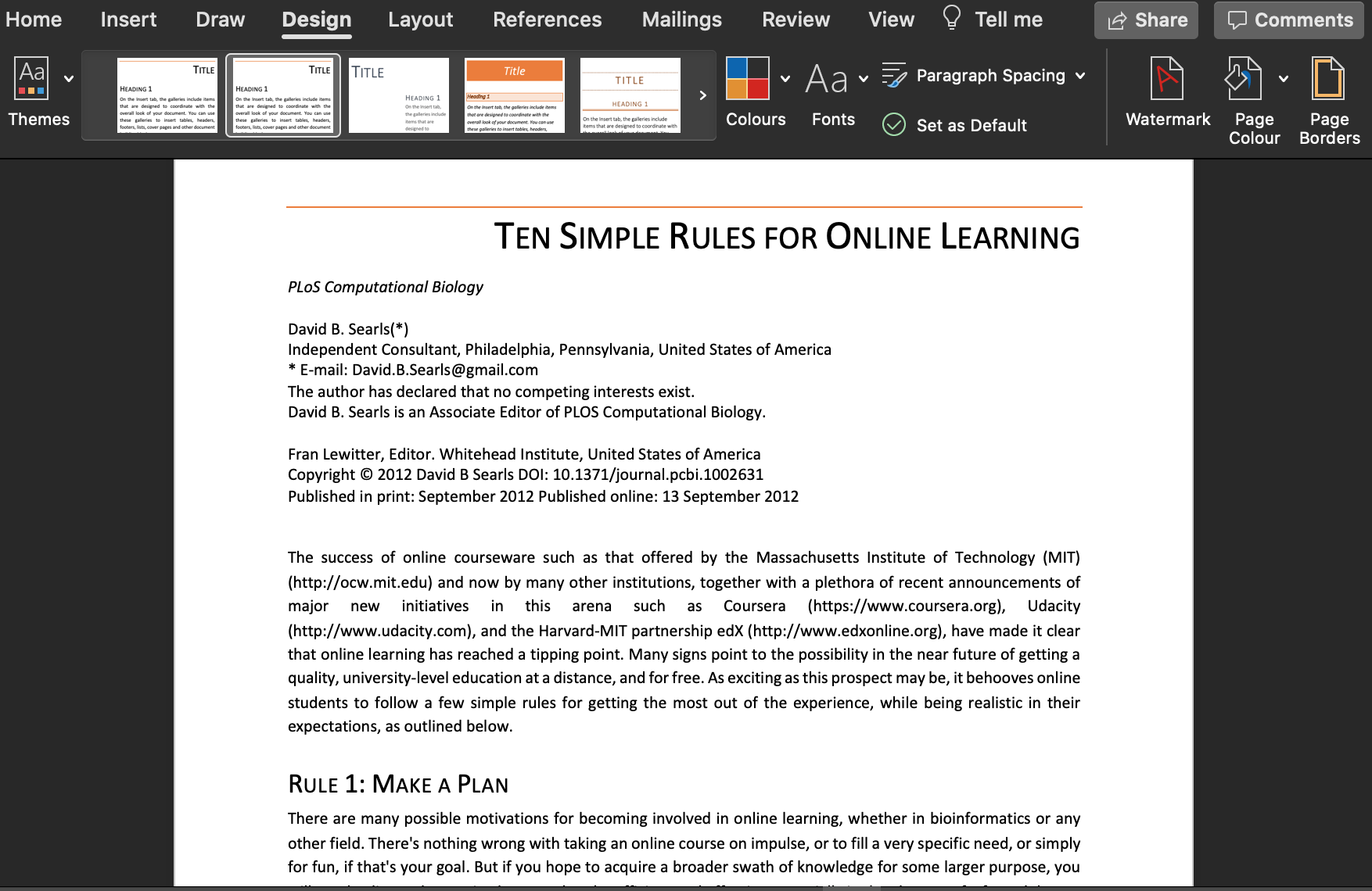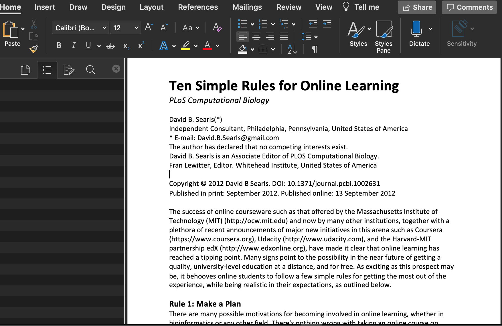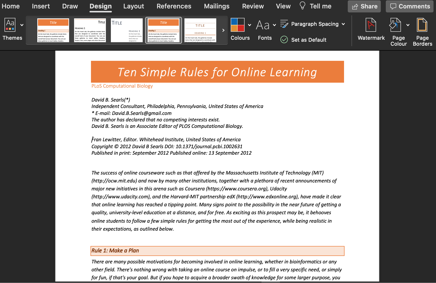 Searls DB. “Ten simple rules for online learning”. PLoS Computational Biology. Epub 2012 Sep 13.