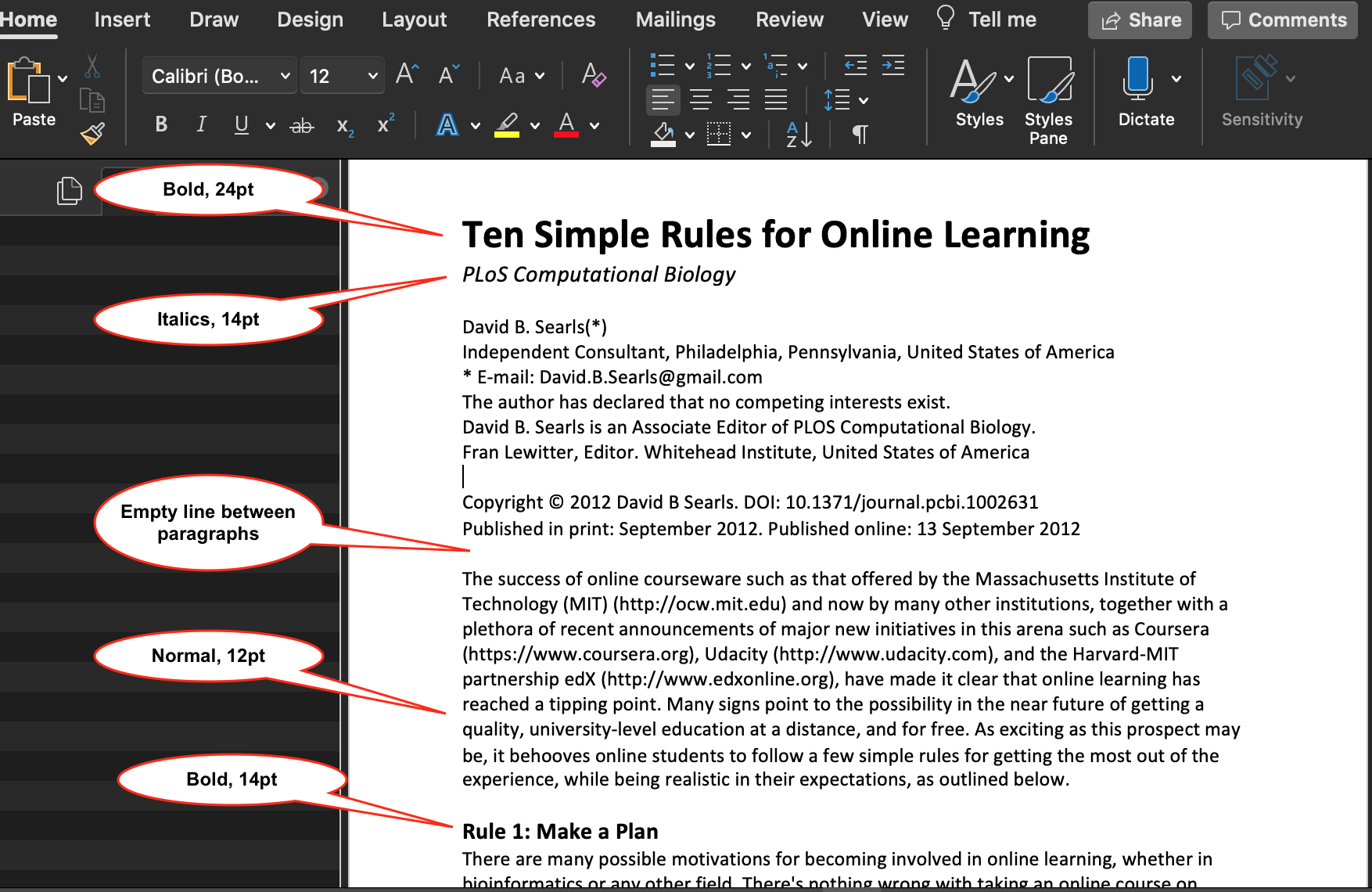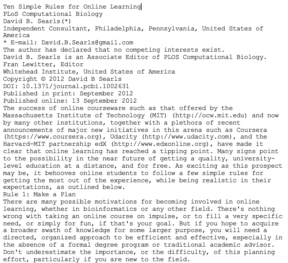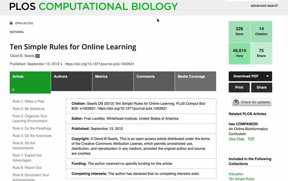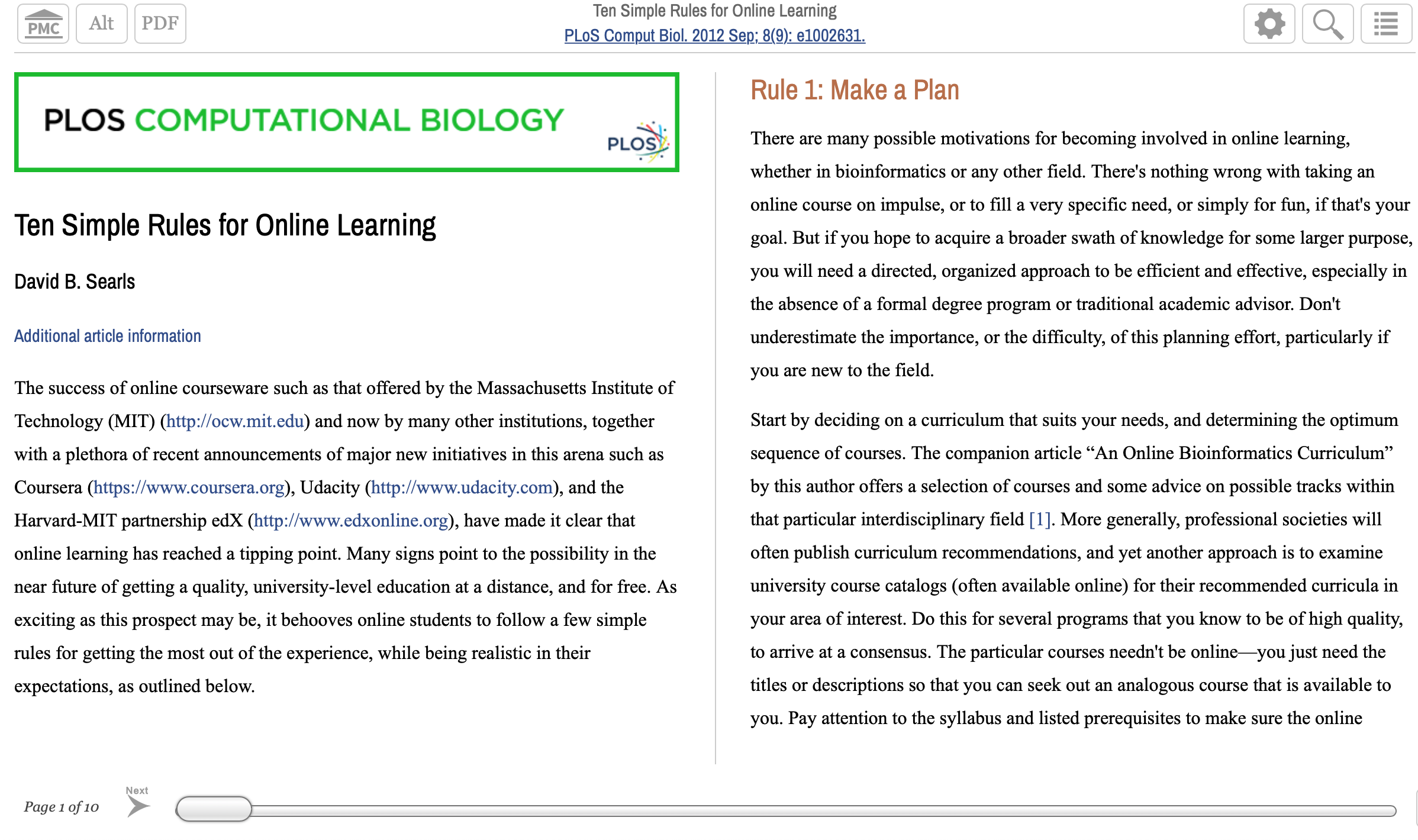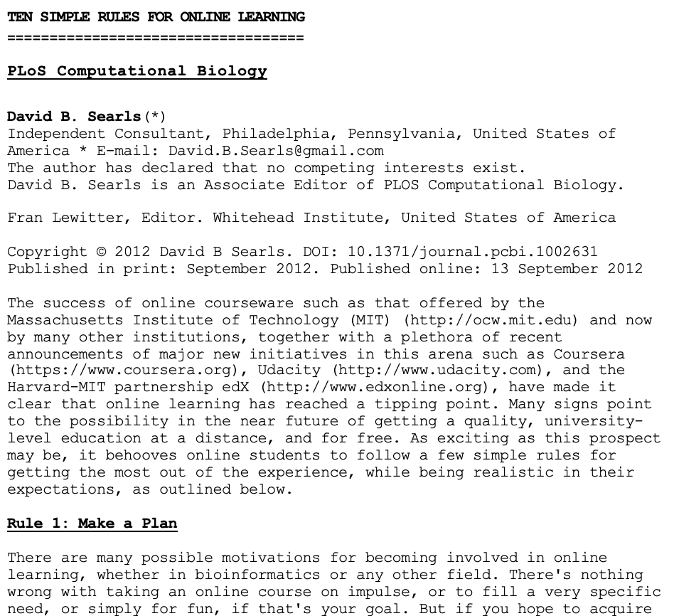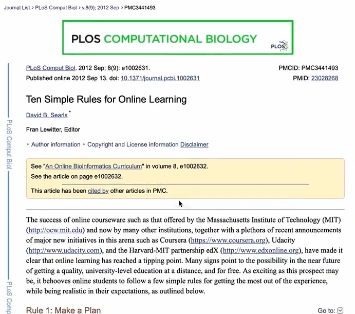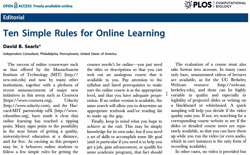 Searls DB. “Ten simple rules for online learning”. PLoS Computational Biology. Epub 2012 Sep 13.